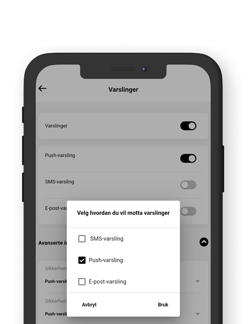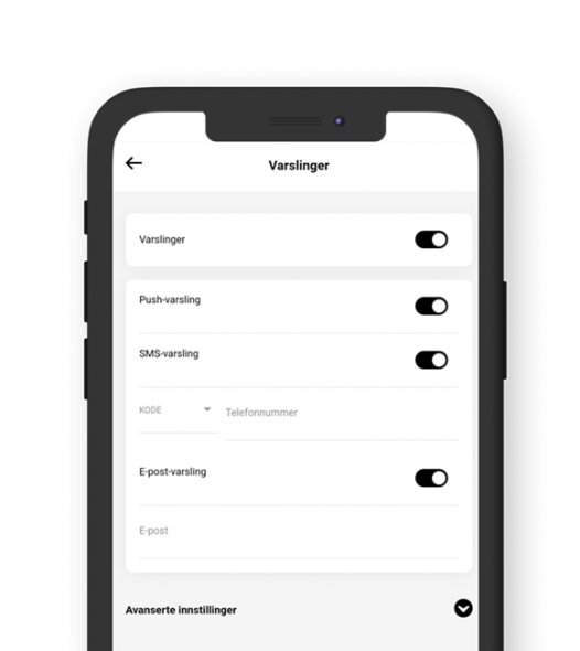 E-post | Du vil motta en e-post med varselet til den e-postadressen som registreres i menyen for varslinger.