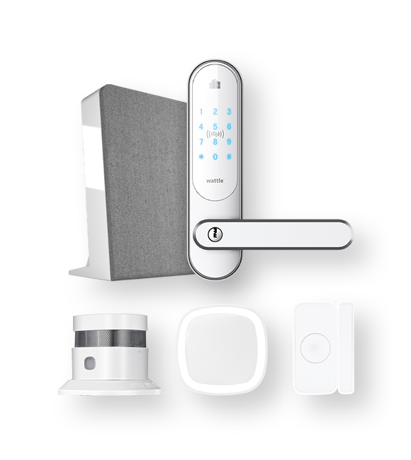 Inkluderer Elektronisk dørlås Smart, smarthussentral, røykvarsler, bevegelsesdetektor og magnetkontakt
