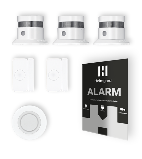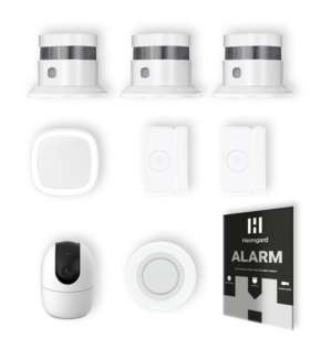 Inkluderer sirene, 3x røykvarslere, 2x dør- og vindussensorer og alarmskilt med refleks for merking av bolig.