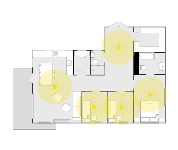 Det bør være minst en røykvarsler i hver etasje, men vi anbefaler ekstra detektorer i oppholdsrom og soverom. Røykvarsleren skal plasseres i taket, minst 50 cm fra veggen og minst 30 cm fra takvifter eller lys.