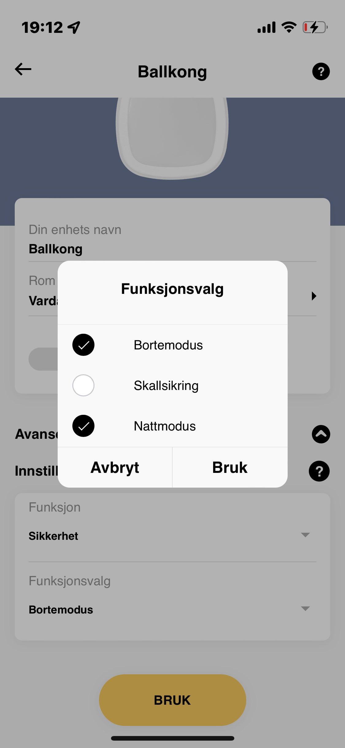 Alle alarm-sensorer er aktive. I dette moduset er også kamera som er satt opp som «Ved bevegelse og bortemodus er aktiv» med som støttespiller og lager opptak ved trigget bevegelse. Les mere om kamera her.