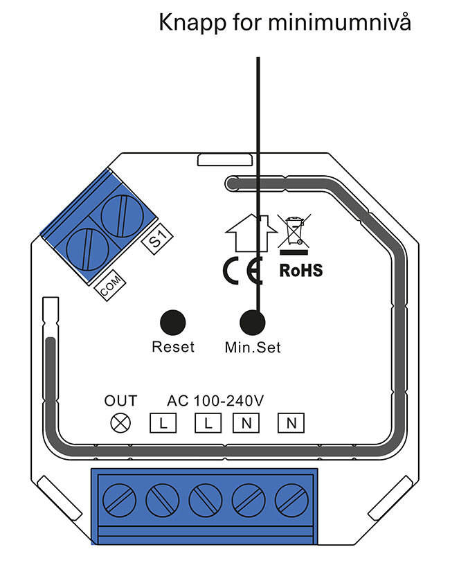 - Trykk og hold inne knappen for minimumnivå i 3 sekunder eller til det tilkoblede lyset blinker for å stille inn lysstyrkeverdien.