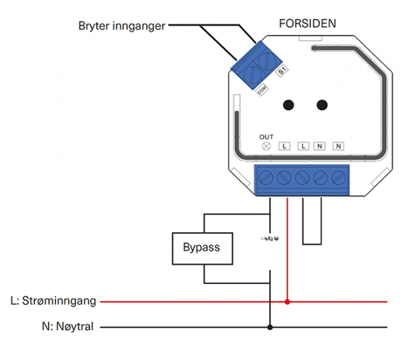 Bypass skal brukes med LED-pærer eller energisparende kompaktlysrør og ingen nøytral ledning.