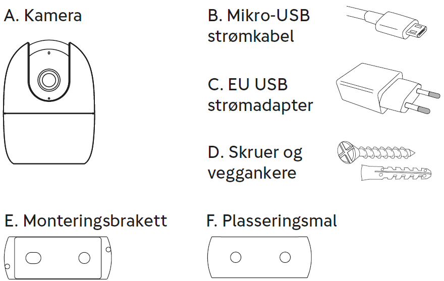 Strømkabel, strømadapter, skruer og veggankere, monteringsbrakett og plasseringsmal ligger i hulrommet under kameraet i esken. Ved veggmontering trenger du også en drill, samt et bor ved bruk av veggankere.