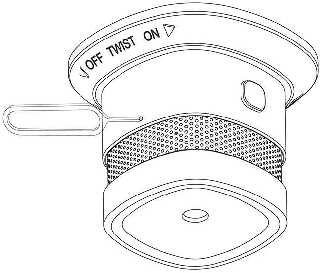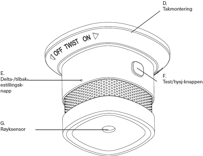 - Vri takbraketten (D) mot klokken for å skille braketten fra røykvarsleren (A). Fjern deretter batteriisolatoren (G) ved å trekke i plasttappen.